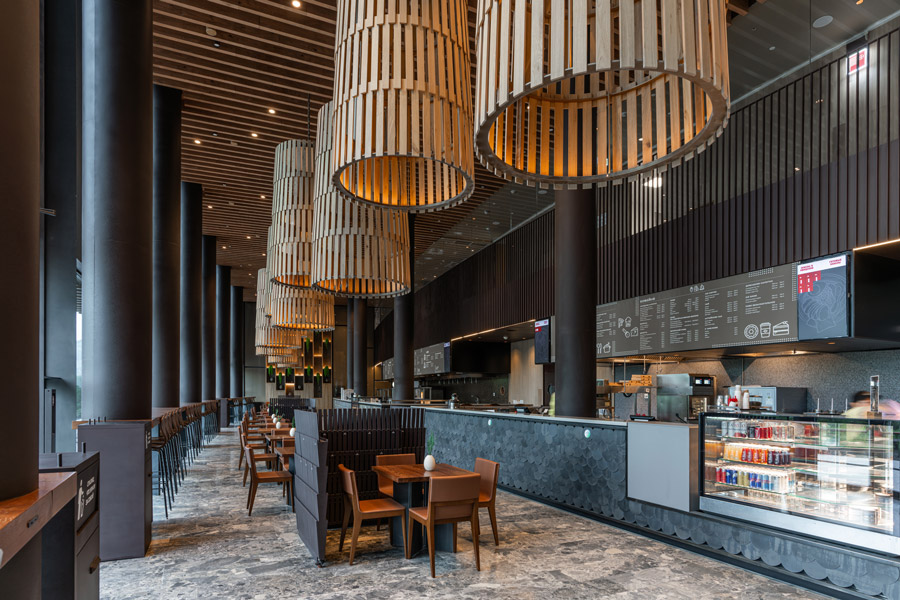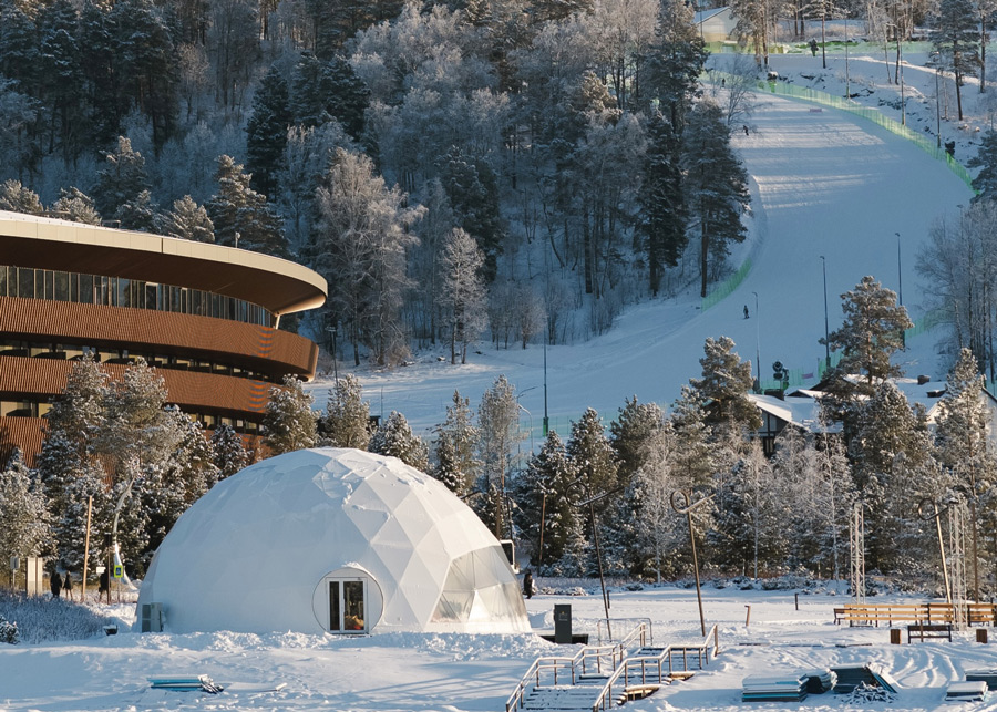 На кресельном подъёмнике можно подняться к самой высокой точке курорта — на высоту 1386 метров. Здесь оборудована смотровая площадка с уютными кафе, где удобно сделать паузу между спусками: согреться горячим напитком и рассмотреть зимние панорамы Алтая, открывающиеся с высоты.