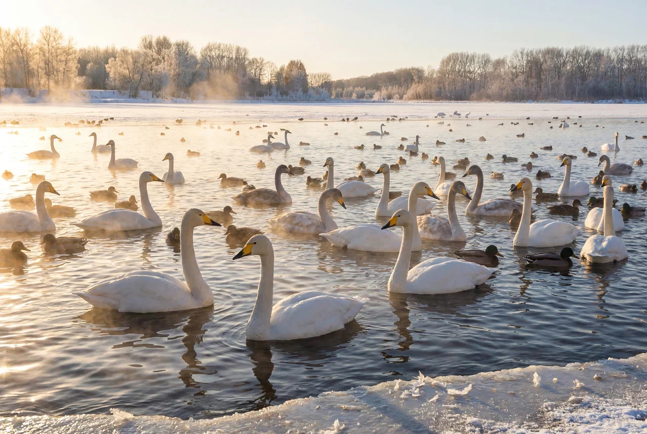Отправляйтесь к озеру, где зимуют величественные лебеди. Кристально чистая вода и заснеженные пейзажи создают идеальные условия для фотографий и умиротворенного отдыха.