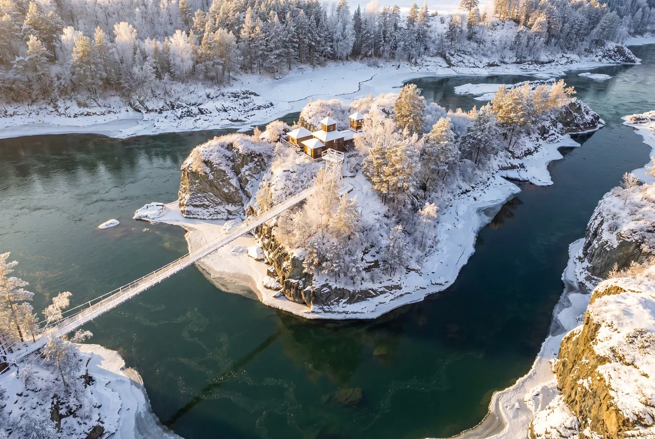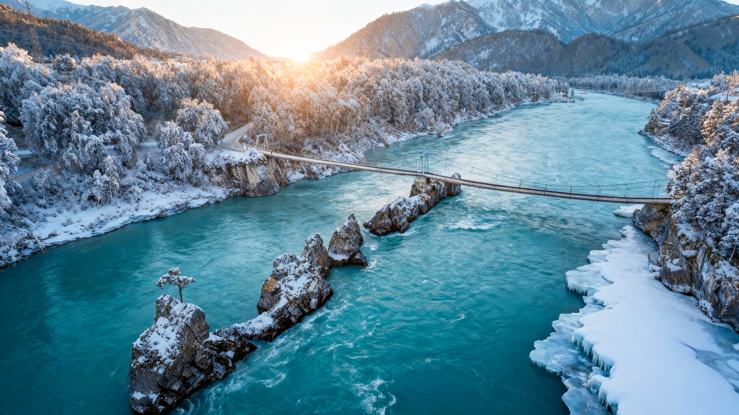 Два символа Алтая в одной поездке: Камышлинский водопад, закованный в лед; остров Патмос — уединенный уголок с подвесным мостом и видами на Катунь.