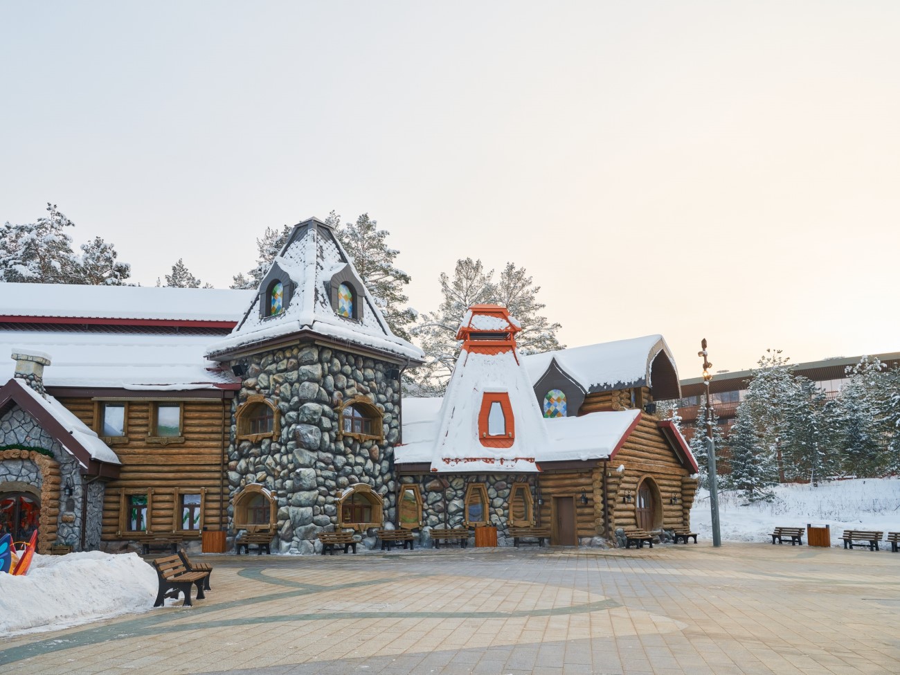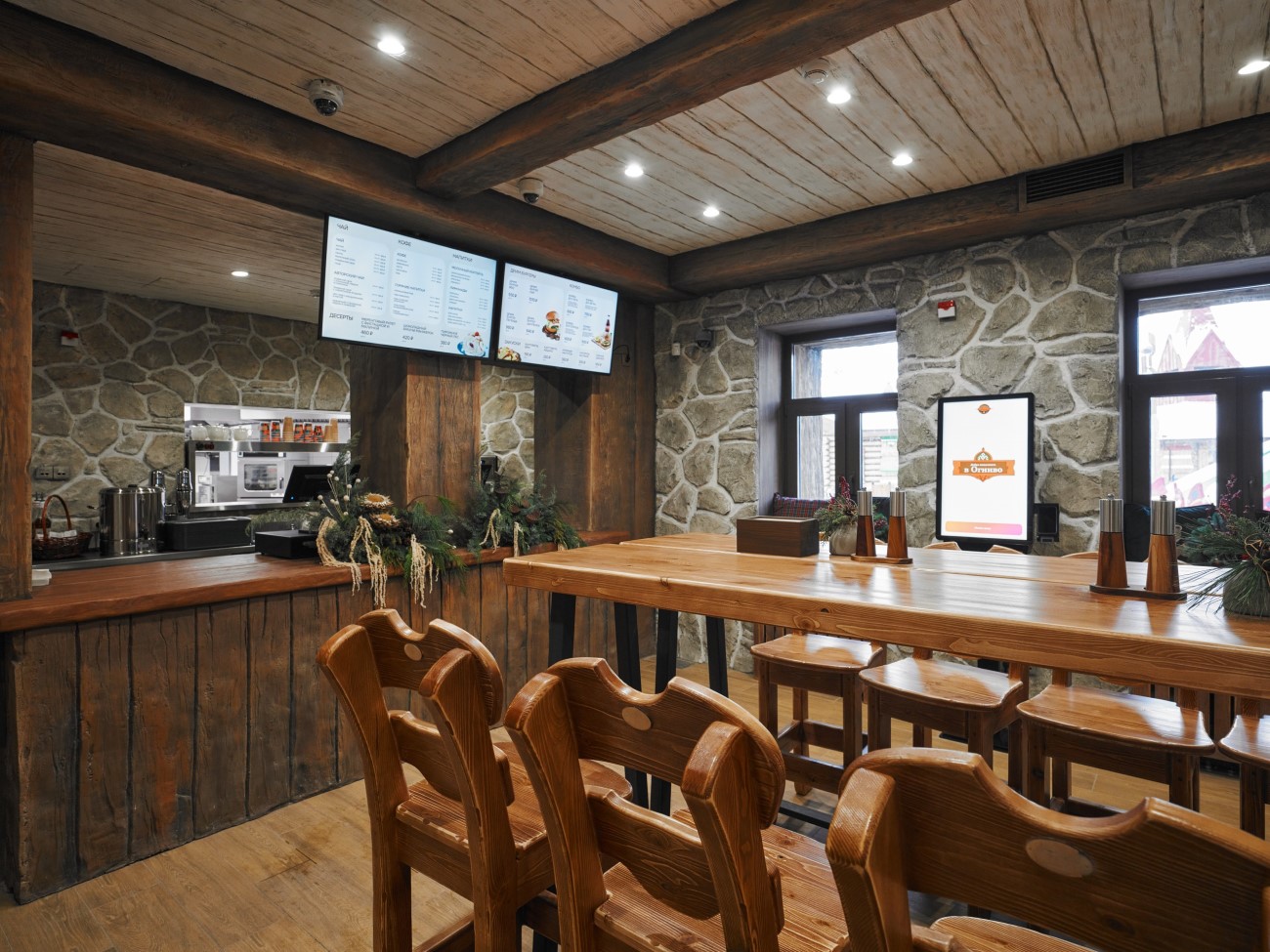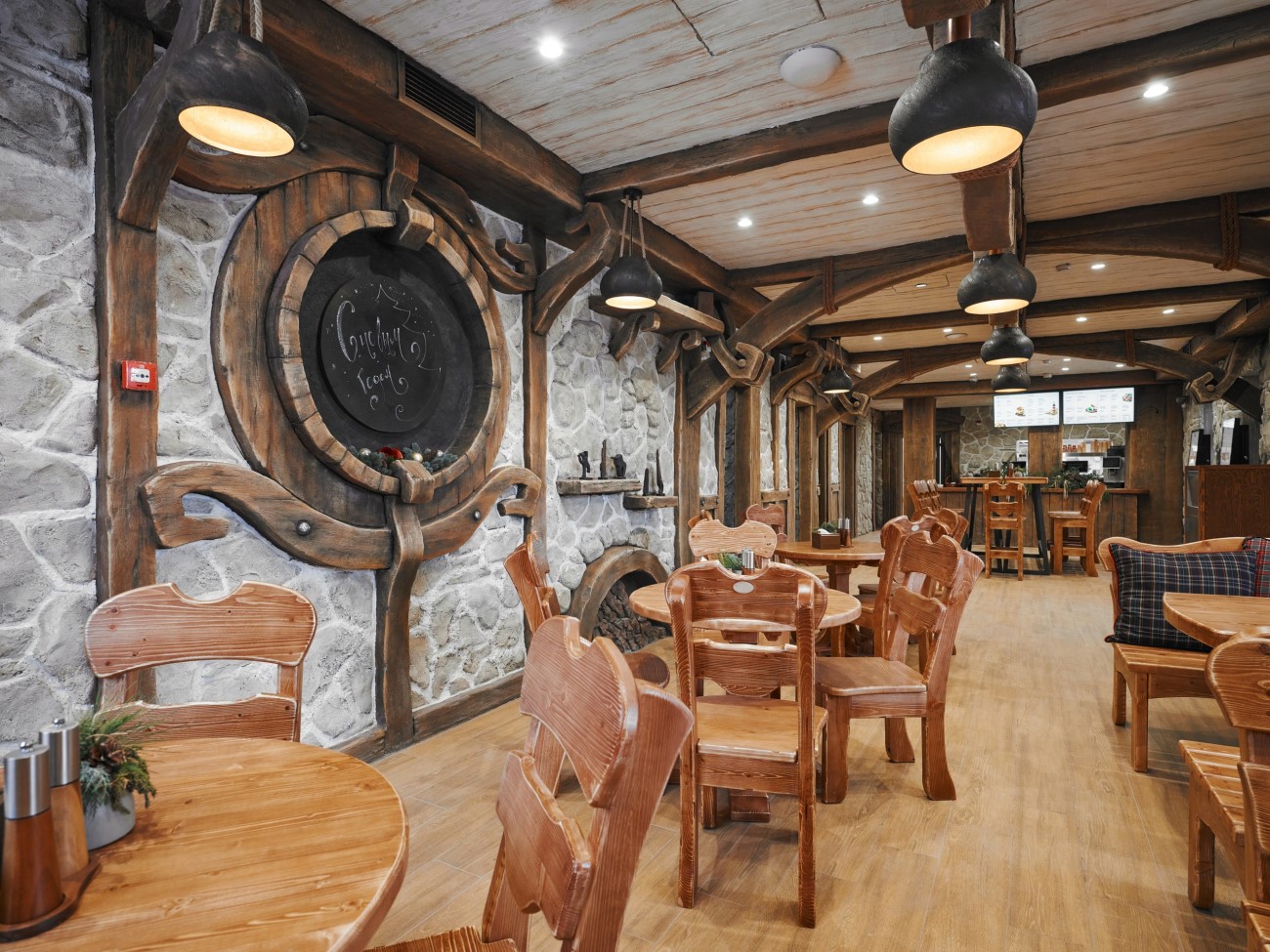 Гриль-бар выполнен в аутентичном стиле: массивные деревянные балки, камень в отделке, резная мебель и мягкий тёплый свет. Интерьер напоминает уютное шале, где приятно согреться после прогулок и приключений.