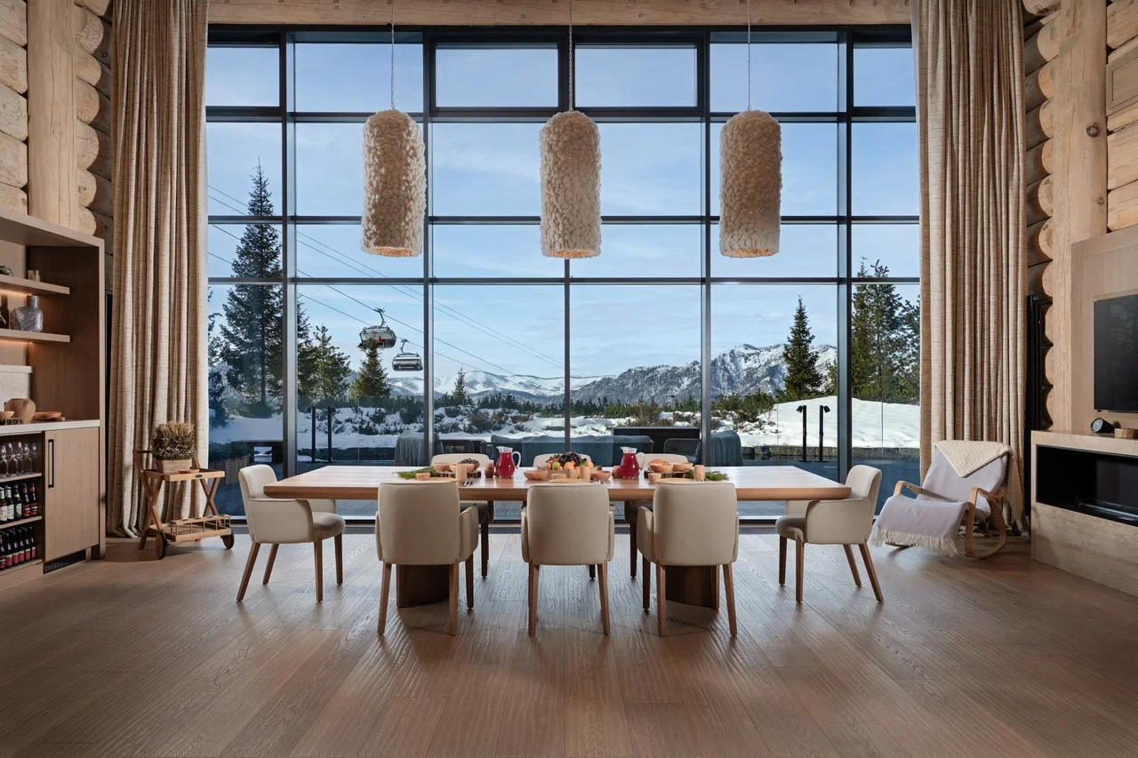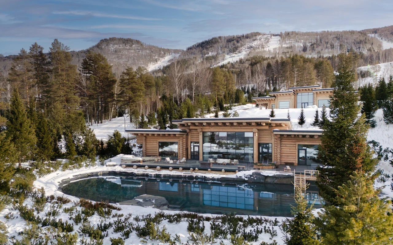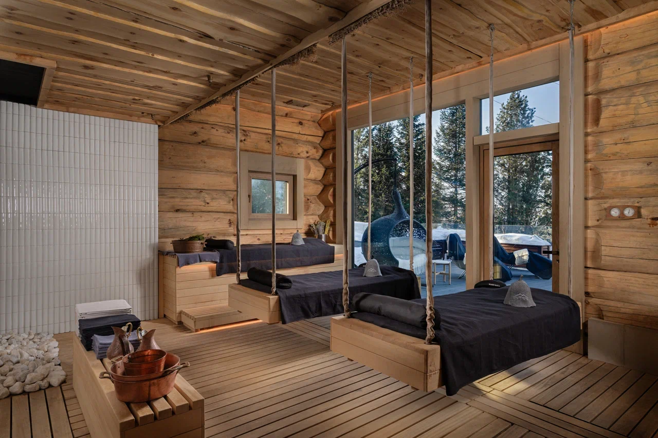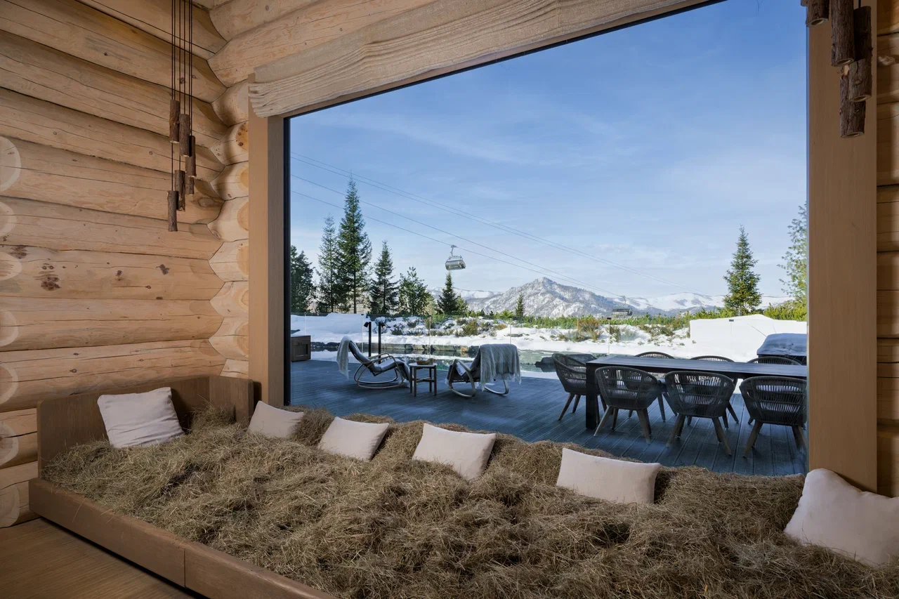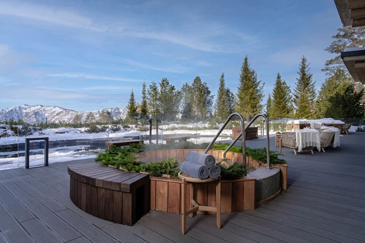 Из бани открывается вид на горы и бирюзовое озеро, служащее купелью под открытым небом.