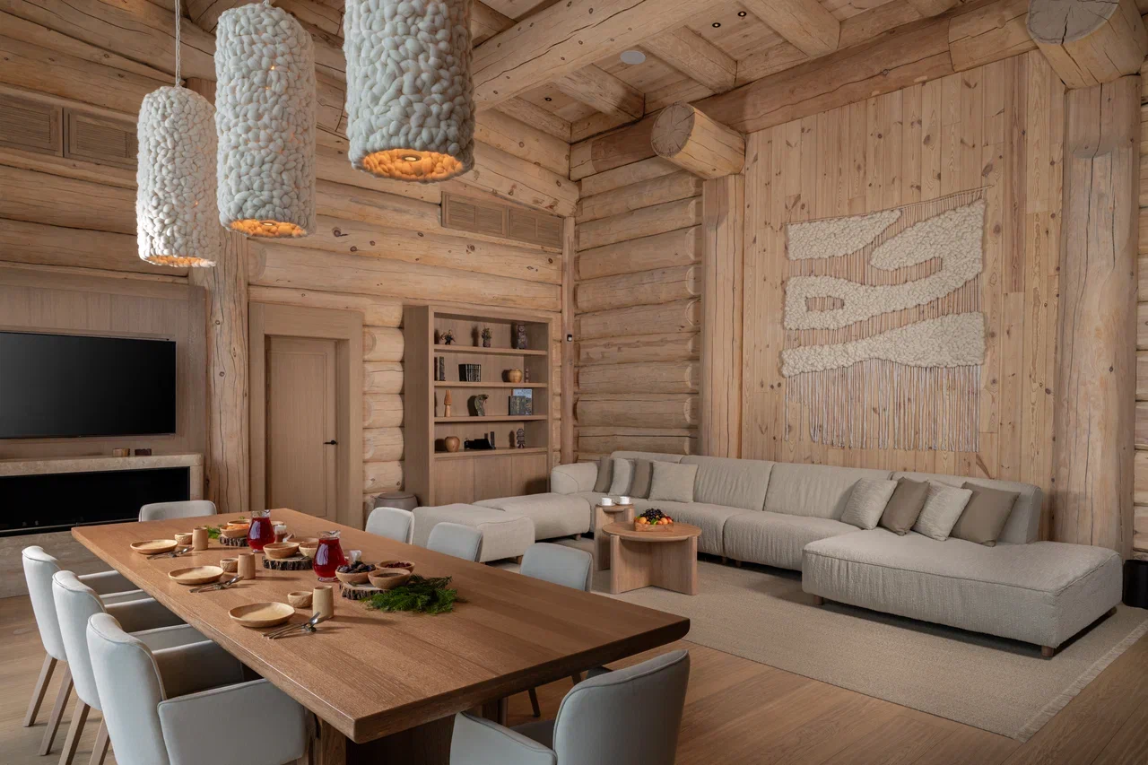 Баня построена из многовекового кедра, древесина которого содержит эфирные масла, обладающие целебными свойствами. Спокойный интерьер в натуральных оттенках дополнен панно из трав, выполненными алтайскими мастерами.