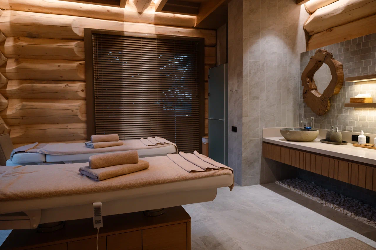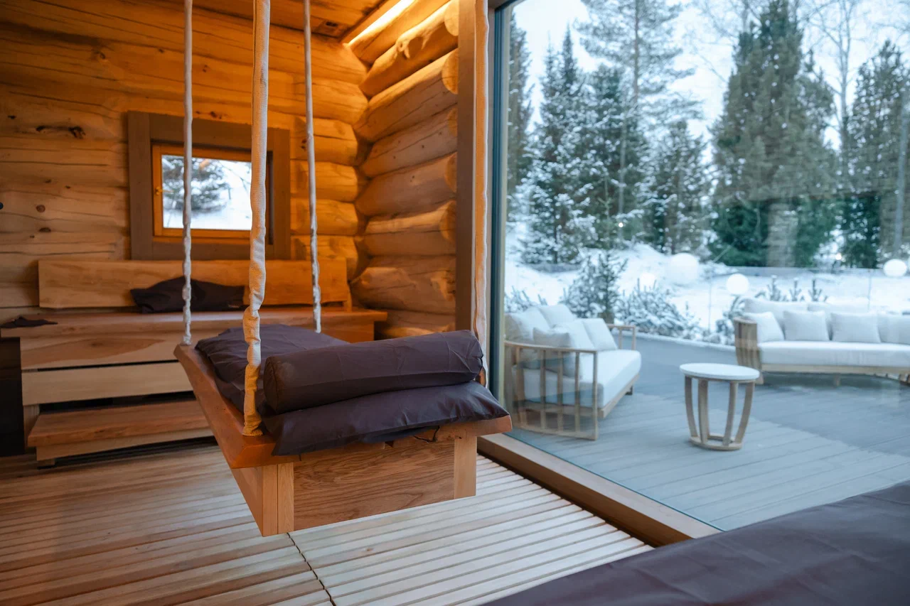 Сердце бани – изразцовая печь «по-серому», а в ее каменку заложен нефрит, полезные свойства которого известны еще с древних времен. С просторной террасы и гостиной открывается вид на бирюзовое озеро, небольшой водопад и живописные закаты.